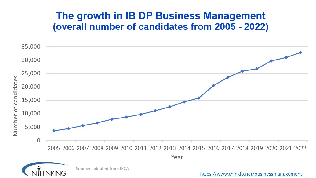 The IB DP Business Management course continues to grow each year. In 2005, there were just 3,622 students who took the Business Management course. By the end of 2022, a total of 32,773 candidates sat the exams for the subject. The chart above shows that the number of BM candidates has grown by 804.8% during the given time period (a highly impressive growth rate by any measure!)