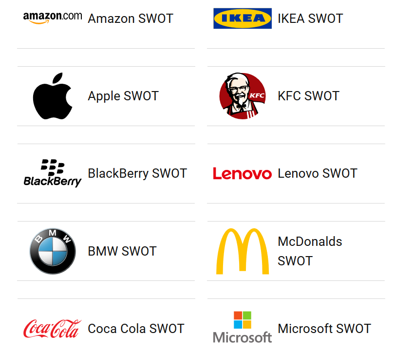Strategic Management Insight is a great website to get your students started with this task - which contains 30 SWOT analyses for different companies to choose from; just make sure they don't just copy/paste but are able to explain the various components in the context of their chosen organization.