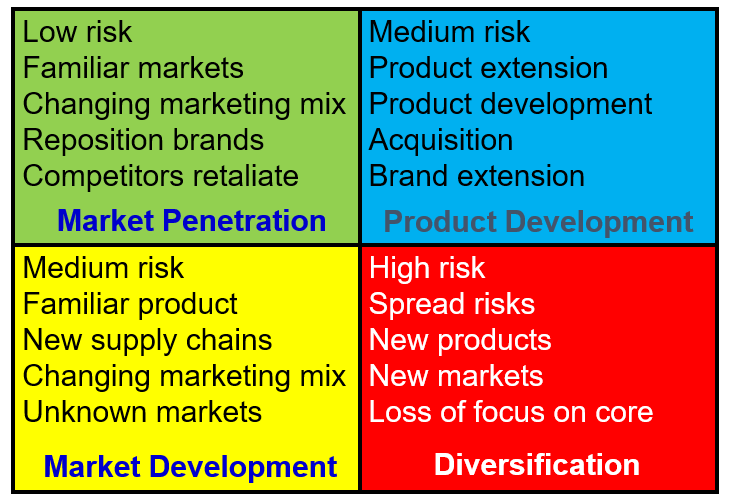 • It does not quantify the risks or rewards associated with the respective strategies. Indeed, the risks involved in the four growth strategies differ substantially. Hence, managers will still need to assess the degree of risks, the likely costs, as well as the potential rewards, associated with each growth option.