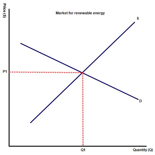 (a) The diagram to the right illustrates the market for a PED elastic product, renewable energy. Illustrate the impact on equilibrium price and output, following the application of a subsidy on the good.
