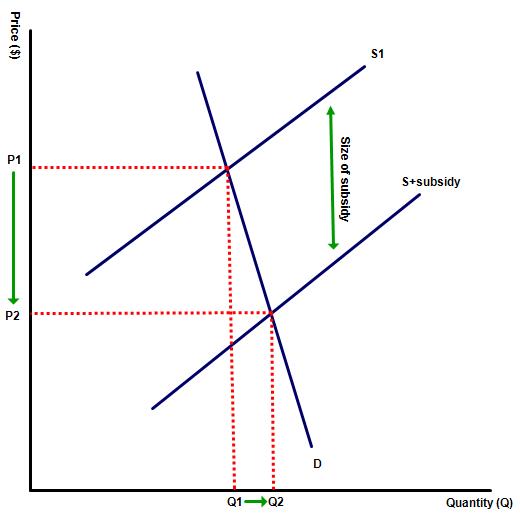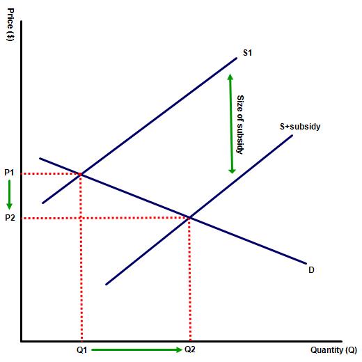 Draw a diagram to show a subsidy, and analyse the impacts of a subsidy on market outcomes.
