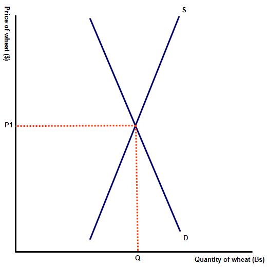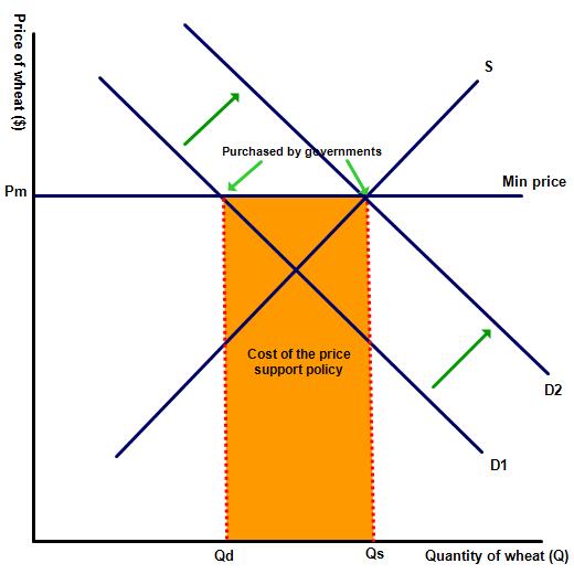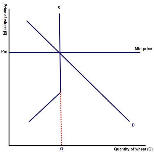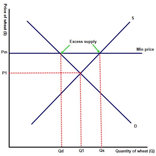 1. The diagram to the right illustrates the market for wheat in a free market. The government decides to implement a price support policy for its wheat farmers by providing a guaranteed minimum price, above the equilibrium price level.