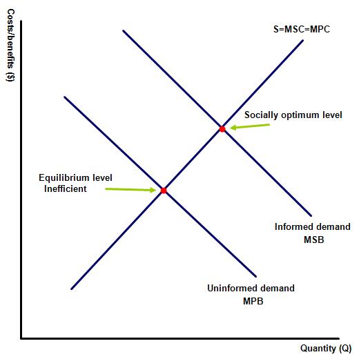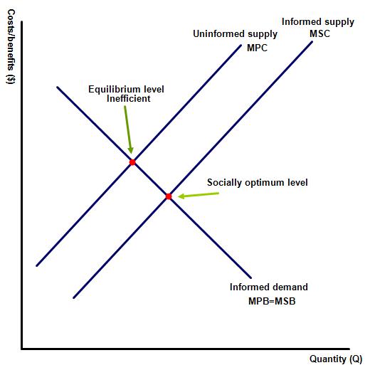 The second diagram, by contrast, illustrates the opposite situation, where the seller is less informed than the purchaser, for example the market for private medical insurance. In this case the purchaser is more aware of their own health than the supplier of the service. Concerned that each person they provide cover for may be in worse health than they claim, the seller is only prepared to provide coverage at MPC, rather than the socially optimum level of MSC. This means that the final selling price ends up higher than the socially optimum price and again few resources are diverted to the production of that good or service. This is because some potential consumers, classified as risky will not be offered coverage, while some healthy customers, unprepared to pay the high price of premiums will decide not to pay for the service.