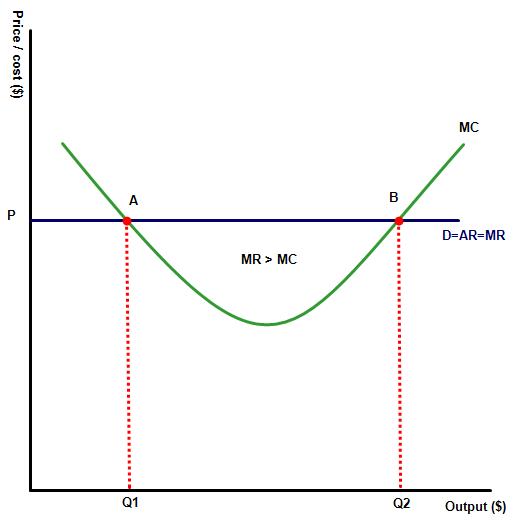 The diagram to the left illustrates the bottom section of a firms marginal costs. In this example, the MC curve intersects with the MR at two different points, illustrated on the diagram below at points A and B.