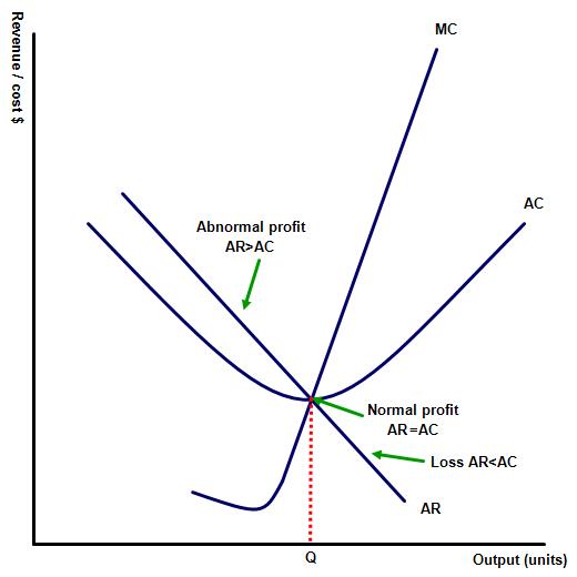Next you are ready to complete your graphs and to do this simply draw the AC curve. It is this curve which determines whether your firm is making a loss or profit. To draw a firm making normal profit simply position the AC curve so that it touches the AR curve at output Q. To draw a loss making firm position the AC curve above so that at output Q the level of average cost is greater than average revenue. Lastly to illustrate a firm making abnormal profit simply draw the AC curve below the AR curve at output level Q.