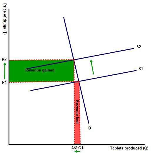 This means that inevitably when a pharmaceutical firm raises its prices, e.g. from P1 to P2 in the diagram then the % fall in demand will be smaller than proportional (Q1 to Q2), meaning that the business will see an increase in its revenue from P1 x Q1 to P2 x Q2.
