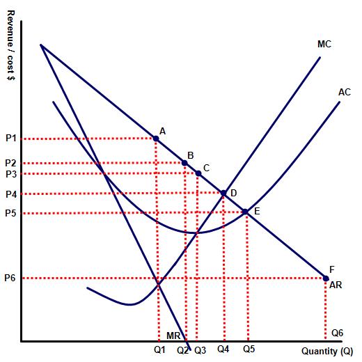 The revenue maximising level of output is at point B, where MR=0. At all points to the right of this, on the PED inelastic portion of the AR curve, the MR < 0.