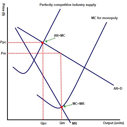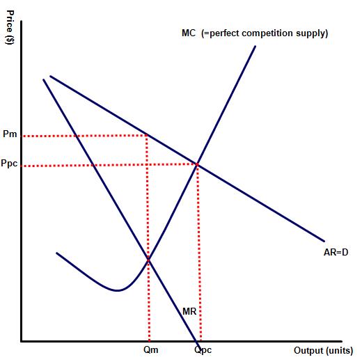 An explanation that without significant economies of scale (diagram above) the monopolist would charge more (Pm) and produce at a lower level (Qm) than a perfectly competitive industry, making a compelling case for government intervention restricting monopoly power.