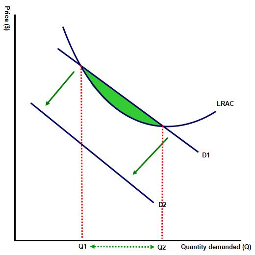 A natural monopoly is a type of monopoly where the economies of scale that exist in the industry are so significant that there is only room for one firm in the market. Competition would simply raise costs for the industry and force all businesses operating in it to make a loss e.g. the space industry (NASA). This is illustrated by the diagram. With just one firm in the market there is sufficient demand to provide a profit. By introducing a second demand for each business falls to D2 and both businesses are forced to shut down.