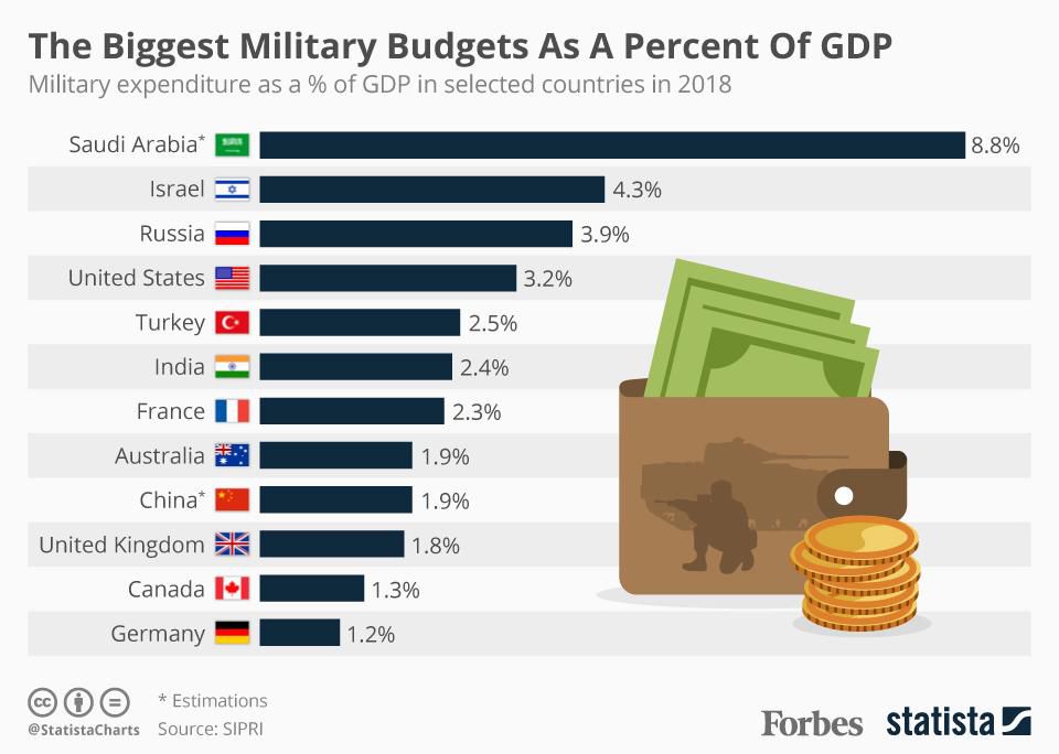 The USA military budget could of course be spent in other areas, for comparison the $600 billion (its actually $640 by 2019) is around the same level as the USA total spending on education, twice the amount spent on welfare payments and half of the amount spent by US citizens on their own healthcare - itself the highest in the world.