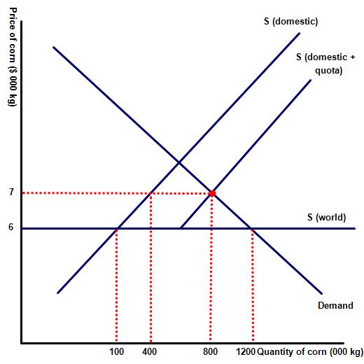 13. The following table represents the market for corn in the EU after the imposition of a quota on imported corn. Total sales of corn after the quota has been introduced are _____
