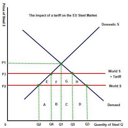 12. The following shows the market for steel into EU, after the imposition of a tariff on imported steel. Which area represents the welfare loss and loss of consumer surplus from the imposition of the tariff.