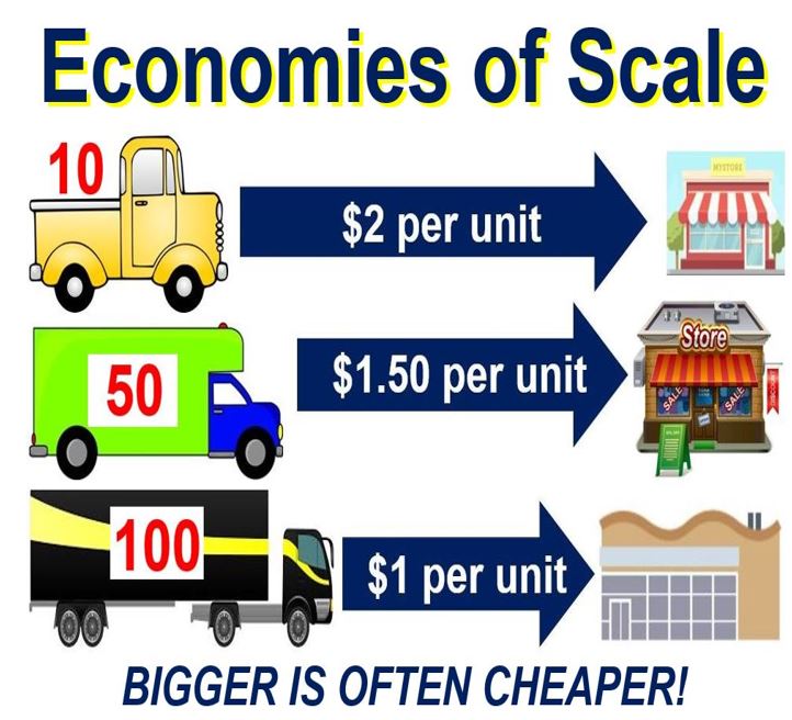 Transport economies - larger companies can benefit from a larger delivery vehicle which is cheaper per unit than using a smaller delivery vehicle