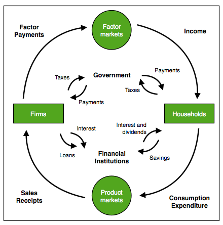 3. The diagram to the right illustrates a simple circular flow diagram. Redraw the diagram indicating the leakages and withdrawals from the circular flow diagram. Explain why the size of the leakages and withdrawals determines the size of the multiplier?