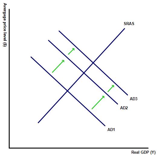 The initial equilibrium is represented by the intersection of AD1 and SRAS. Following the government stimulus AD rises to AD2, with the effect of the multiplier increasing the total increase in aggregate demand to AD3.