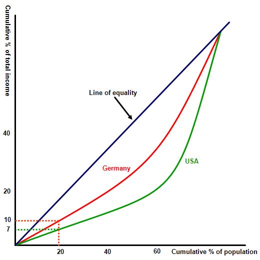 A suitable diagram such as a Lorenz curve, showing a less equal distribution of income in market economic systems, such as the USA, compared to a more mixed economic system such as Germany.  For example on the diagram the poorest 20% of the population in USA own collectively less than the lowest 20% of earners in Germany.