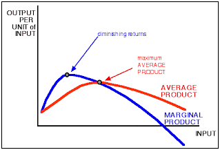 Law of diminishing returns - the law that states as you continue to add increasing variable factors to a fixed factor the average output and marginal output will eventually fall. After this point total product may continue to rise but at a slower rate.