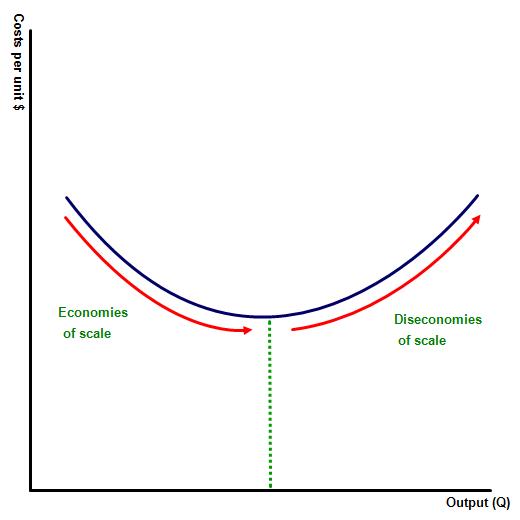 Initially as the firm increases inputs of labour and machinery output rises as the new workers add to the production process. Initially two workers can produce twice as much as one e.t.c. and perhaps even more if they can make full use of greater specialisation. Also as more machines are purchased output rises. As output rises quickly average costs will fall as the level of output rises at a faster rate than the rise in number of inputs (labour, machinery and materials). This is called increasing returns to scale. However as the rate of increase in output declines the output per worker falls, leading to higher average costs. This is called diseconomies of scale.