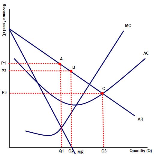 If you have drawn your diagrams correctly both firms should be producing at where MC = MR and both should also have a downward sloping demand / AR curve and a MR curve below the AR curve, cutting the X axis at the revenue maximisation output level. On both diagrams you should draw a line up from output Q to the AR line to derive the price at which the business is selling its products. The AC curve is drawn last and this determines whether or not the firm is making abnormal profit or a loss. To draw a loss making firm position the AC curve above so that at output Q the level of average cost is greater than average revenue. Similarly to illustrate a firm making abnormal profit simply draw the AC curve below the AR curve at output level Q. A monopoly firm making a normal profit could be illustrated by positioning the AC curve so that it touches the AR curve at output Q.