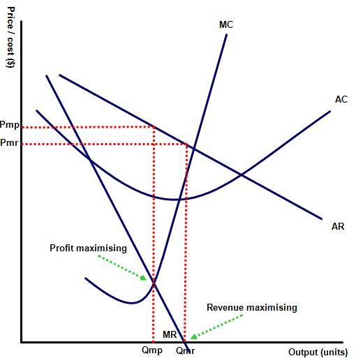 Explain, using a diagram, the output and pricing decision of a revenue maximising monopoly firm. Compare and contrast, using a diagram, the equilibrium positions of a profit maximising monopoly firm and a revenue maximising monopoly firm.
