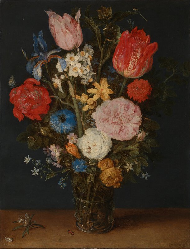Early on in the 1600s, a Flemish painter Jan Brueghel the Elder painted a small but beautiful painting of a bunch of cut flowers in a glass vase. Painted in oils it enhanced the brightness and intensity of the hues. The photograph to the right is a copy of the original painting.