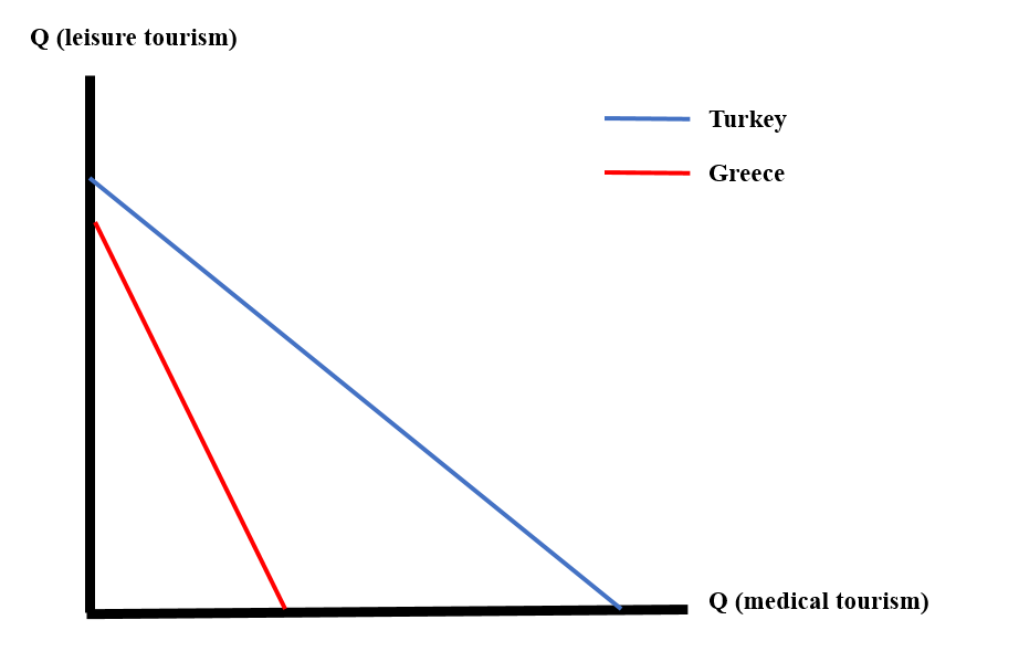 I made the following chart to illustrate approximately how Turkey and Greece compare to each other in production of leisure and health services. The x-axis shows production of health services, and the y-axis, production of leisure services.