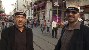 Photo: Men wearing hair transplant bandages in Istiklal Avenue, Istanbul