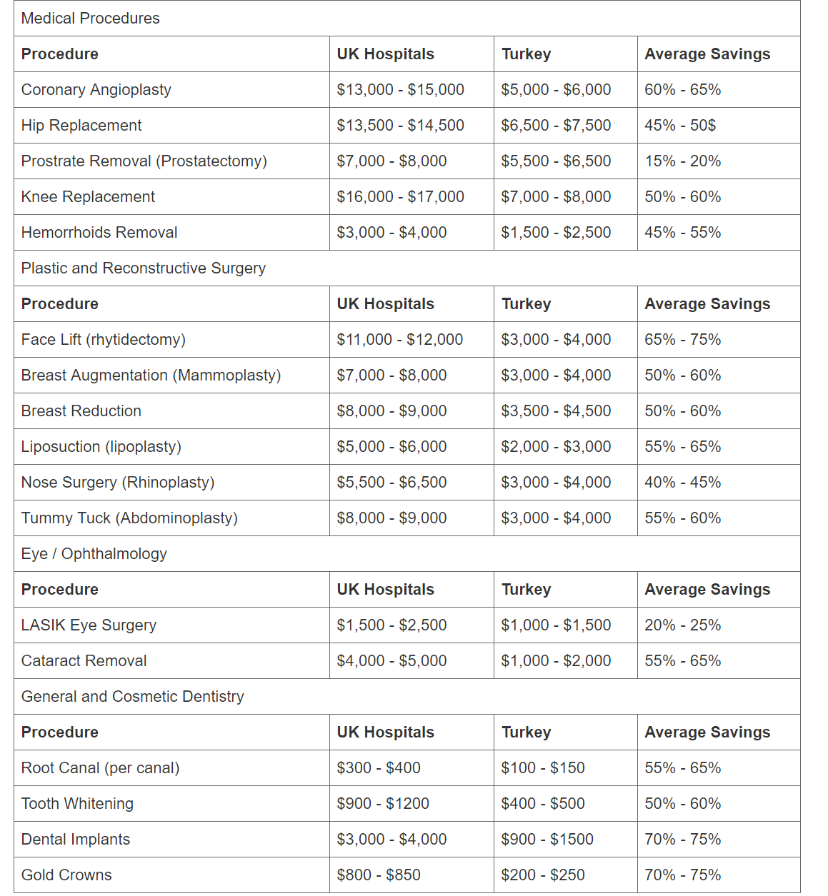 Source: Medical Tourism in Turkey Portal, “Cost of Medical Treatment in Turkey” (2017)