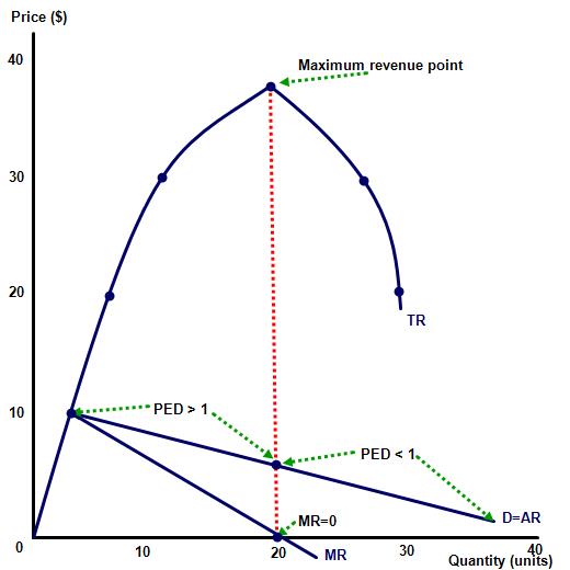 (c) If a theoretical business was producing a perfectly elastic good (PED = infinity) then explain what will happen to both MR and AR as the firm raises its output?