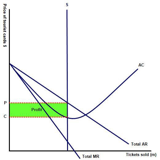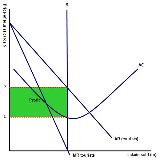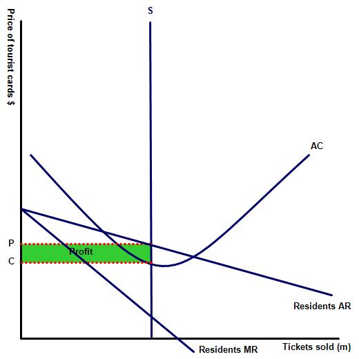 In common with many other tourist attractions around the world, the Bath tourist card has two distinct markets - tourists who are willing and able to pay a high price for the card and whose PED elasticity is low, as well as local residents with a much higher PED. Diagram 3 illustrates the market for the tourist cards in a situation where the tourist board charged the same price to both tourists and and local residents. Diagrams one and two illustrate the impact on the market when the consumer is divided into two distinct markets - higher profits and arguably greater access to local attractions for local residents. This is because without the more profitable tourist ticket the tourist board may not be able to offer so many attractions?