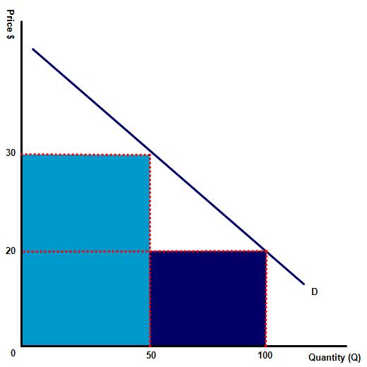 In this example the company reduces the price when the user sends more than 50 messages per month. Without offering this discount, to customers buying in bulk, the company would receive only the revenue represented by the pale blue rectangle. By offering the discount to customers willing and able to purchase 100 text messages each month the firm makes additional revenue, represented by the dark blue rectangle.