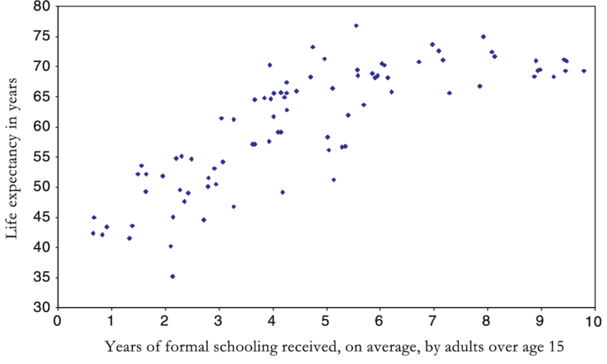 The diagram to the right illustrates the relationship between mean years of schooling and life expectancy, in a range of nations.