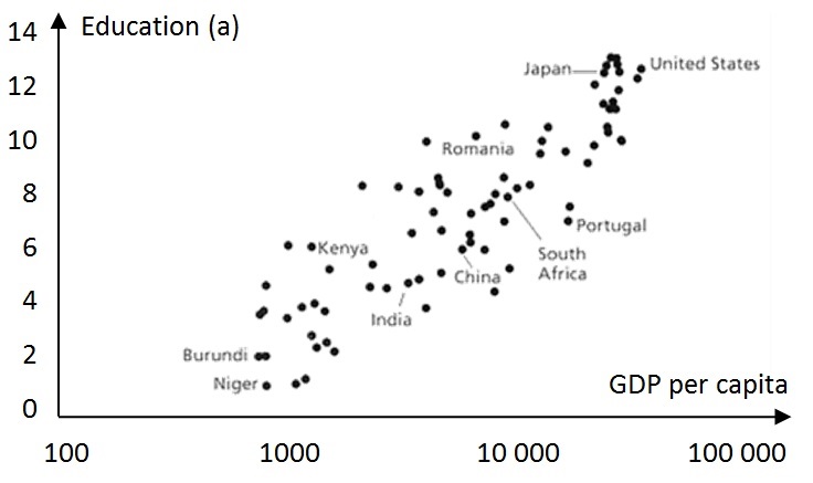 The diagram to the left illustrates the relationship between GDP per capita and the number of years that the average citizen spends in education.