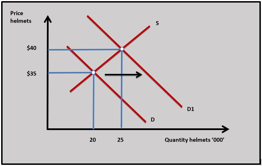 As the demand for bicycles increases there could be an increase in demand for bicycle lights, repairs, cycle clothing and helmets, etc. For example, the demand for helmets would increase in demand from D to D1.
