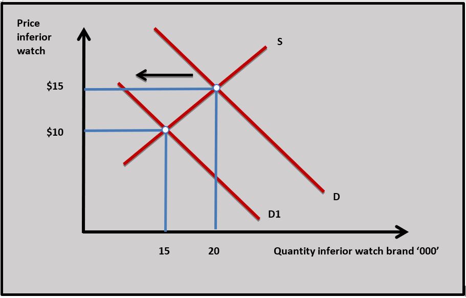 Certain brands of cheap watches might be inferior goods. As incomes rise the demand for inferior watch brands would decrease and this could be shown by a fall in demand from D to D1 in the diagram.