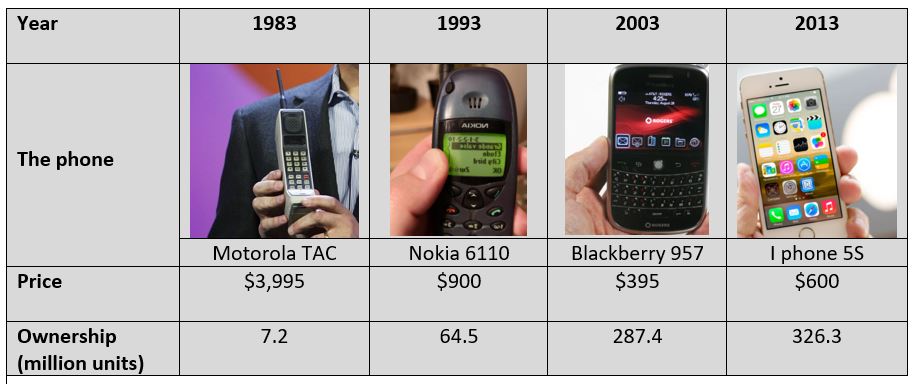 The ownership of mobile phones might have increased from 2003 to 2013 because the quality of the mobile phone has improved which makes the phone more attractive to buyers even though it is at a higher price. The iPhone, for example, offered more sophisticated features than the Blackberry such as touchscreen use and a better visual display.