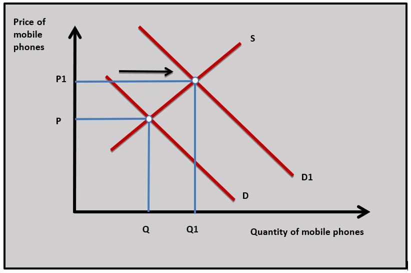 - The diagram shows an increase in demand for mobile phones from D to D1.