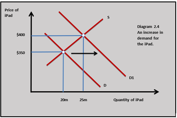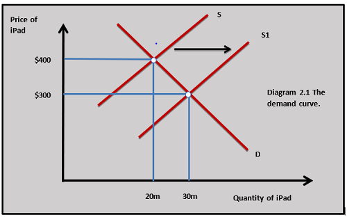 The demand curve or demand schedule shows the negative relationship between the price and quantity demanded of a good or service. This is shown in diagram 2.1 where the quantity demanded of the iPad increases from 20m units to 30m units as the price of them falls from $400 to $300. In this case, the price has fallen because the supply of the iPad has increased because of improvements in technology.