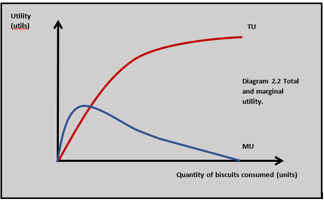 The relationship between total utility and marginal utility and units consumed is shown in diagram 2.2. If you relate the marginal utility from consuming each biscuit to the price the individual is prepared to pay for the biscuit in the table, you can see the price the individual is willing to pay falls as consumption increases because the marginal utility falls.