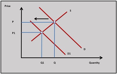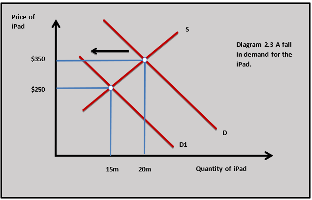 Changes in the price of a substitute for a good cause a change in demand for the good and the demand curve shifts. This means the quantity demanded for a good changes at each price. In our IPad example, a fall in the price of laptops causes the demand for the iPad to shift to the left. The fall in demand for the iPad is shown in diagram 2.3. As demand falls, the price of the iPad and the quantity traded both fall.