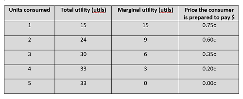 This is shown in the table where the amount the individual is prepared to pay for the chocolate biscuits goes down as their marginal utility diminishes. For example, the individual in the table is prepared to pay 0.75c for the first biscuit they consume because they receive 15 utils (marginal utility) of satisfaction from its consumption, but are only willing to pay 0.20c for the fourth biscuit because they get 3 utils (marginal utility) of satisfaction from its consumption.