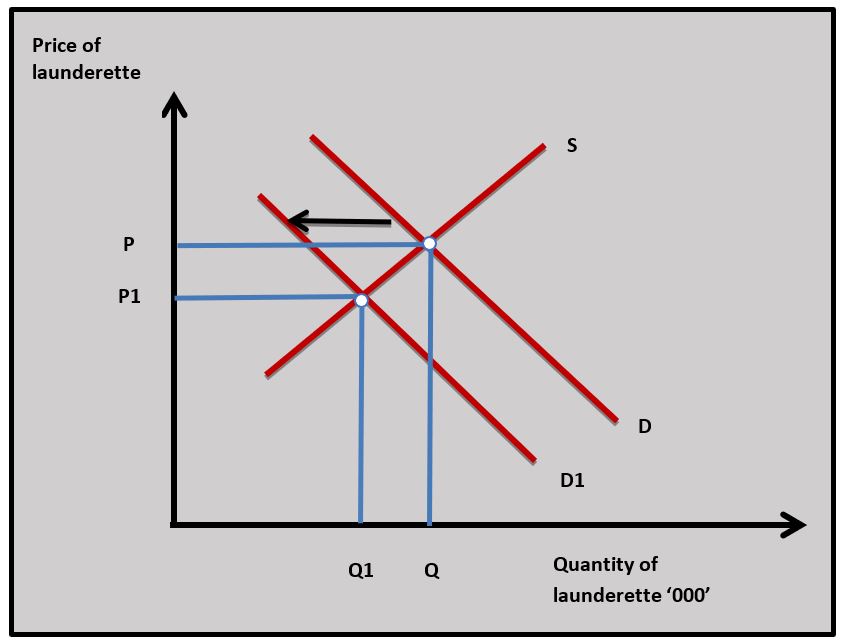 The demand for Launderette services has fallen in the UK as household incomes have increased because more households can afford to own a washing machine and consumers have substituted launderettes services for a washing machine. This is shown by a fall in demand for launderette services.