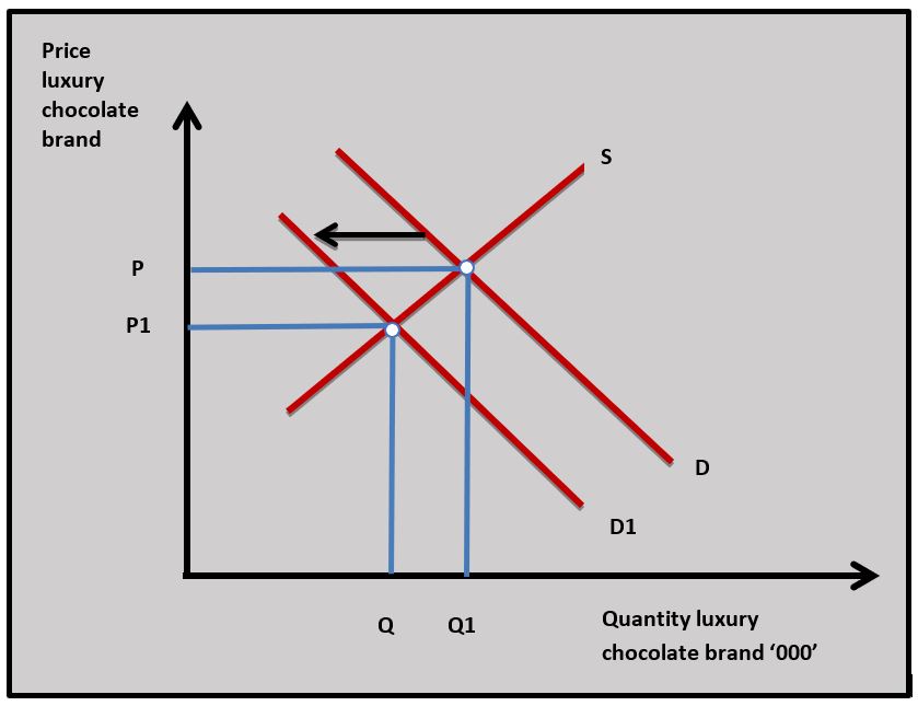 In a recession, household incomes may fall and this could lead to a fall in demand for a luxury good with a relatively high YED value of 1.3.