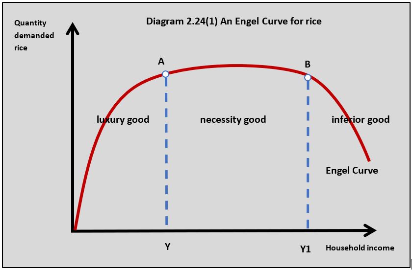 The nineteenth-century German economist, Ernst Engel studied how the demand for different goods and services changed with income over time. The Engel Curve relationship between income and demand is shown in diagram 2.24(1). In this example, the diagram shows how the demand for rice changes with income over time.