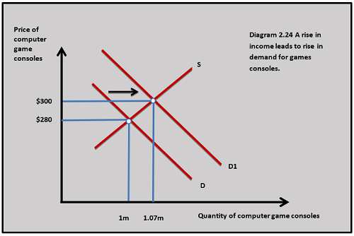 This means that for every 1 per cent increase in household income the quantity demanded of games consoles will increase by 1.4 per cent. This relationship is shown in diagram 2.24 where a rise in income causes the demand curve for game consoles to increase and shift to the right.