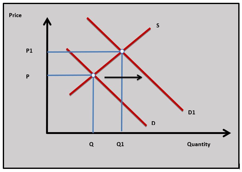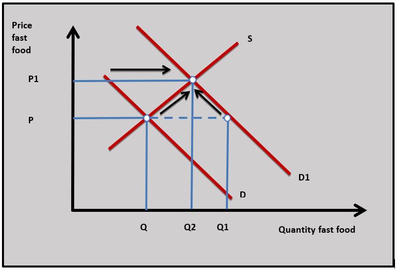 - An explanation that as demand rises in a market it creates excess demand at the existing market price. This causes the market price to rise to ration the good. This process is shown in the diagram where the market price for fast food rises from P to P1.