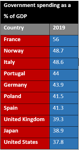 nments play an important role in all economies. The table sets out government expenditure as a percentage of GDP for the world's 10 leading industrialised countries. With an average government spending in these countries of over 40 per cent of GDP, you can see how influential governments are in different countries. This is a macroeconomic way of looking at levels of government intervention, but governments are heavily involved at a microeconomic level as well through taxes and subsidies.