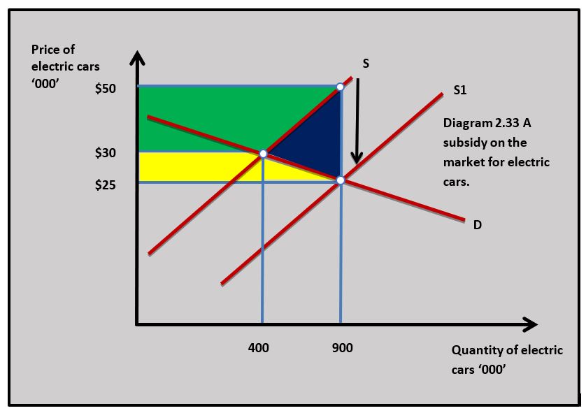 A subsidy needs to be paid for by the government which means there will be an opportunity cost of money that has been sacrificed from other areas of government expenditure. A subsidy on electric cars might mean there is less expenditure on the roads. Alternatively, a government might have to raise taxes to pay for the subsidy. There may also be a cost to the government in terms of managing and distributing a subsidy.