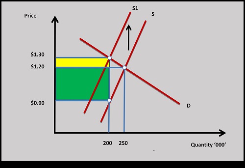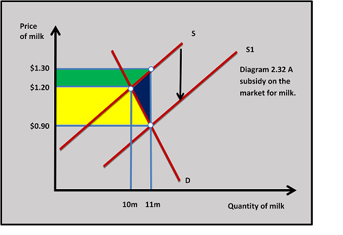 For example, if the government decides to subsidise milk by $0.40c per litre then the cost of producing each litre of milk will be $0.40p per unit lower.