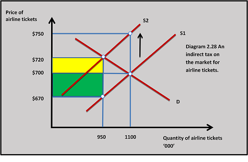 ct tax affects supply in a market because it increases the costs of production. For example, an airline’s cost of supplying a flight is $700 and a $50 specific tax is imposed. The supply cost of that ticket will now be $750 ($700 + $50). This means the supply curve for airline tickets shifts vertically upwards by the specific tax of $50. Diagram 2.28 illustrates the impact of an indirect tax on the market for airline tickets.